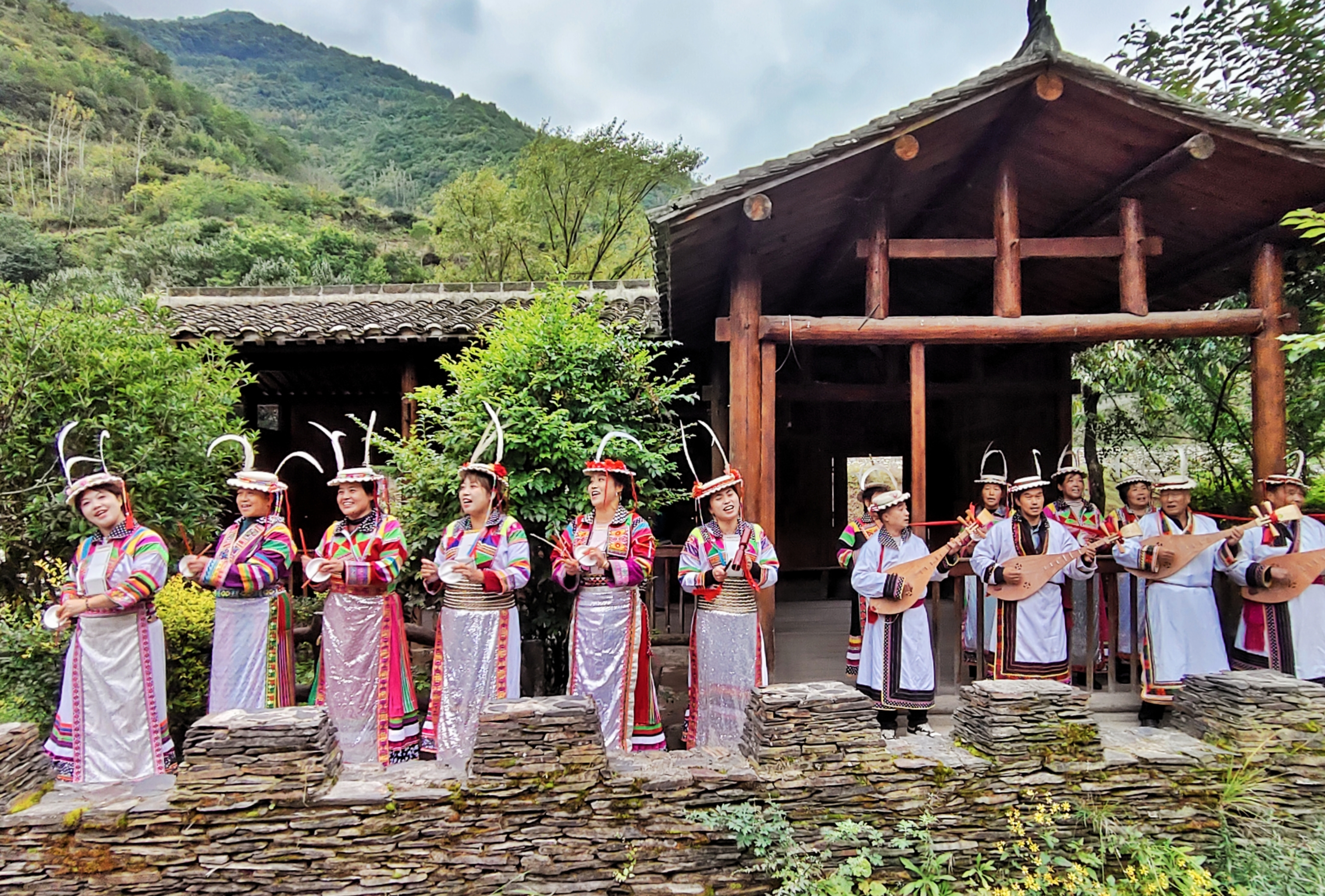 踩线团队首先前往白马山寨开展采风活动。作为中国古代氐人后裔的聚居地,这里完整保留着白马人独特的民俗风貌:男子头戴插有白色雄鸡尾羽的毡帽,女子身着绣有“米”字纹、圆点花等象征太阳星辰纹样的艳丽服饰,古老的农耕生活印记与自然山水相映成趣,构成秋日里独特的人文画卷。
