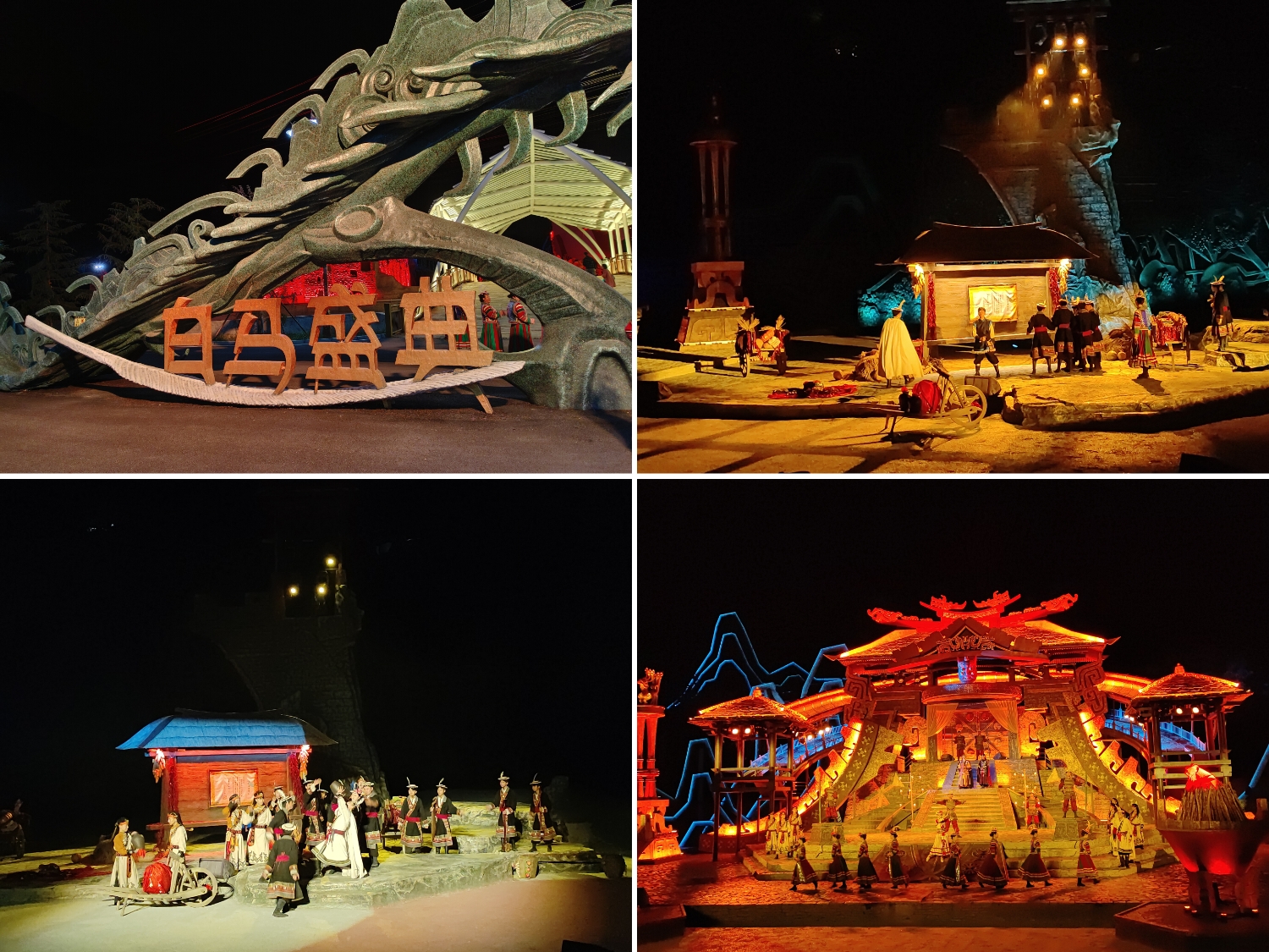 夜幕降临,踩线团队观看了国内首部白马人主题实景剧《白马盛典》。依托360°旋转观众席与自由开合的山体舞台,该剧以白马人英雄史诗《阿尼嘎萨》为核心,通过全息投影技术将“熊猫化兽退敌”“火圈舞祈福”等神话场景生动演绎,山水实景与非遗文化深度融合,打造出沉浸式的视听盛宴,让团队直观感受白马文化的厚重底蕴与艺术张力。