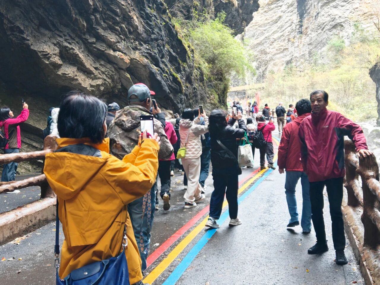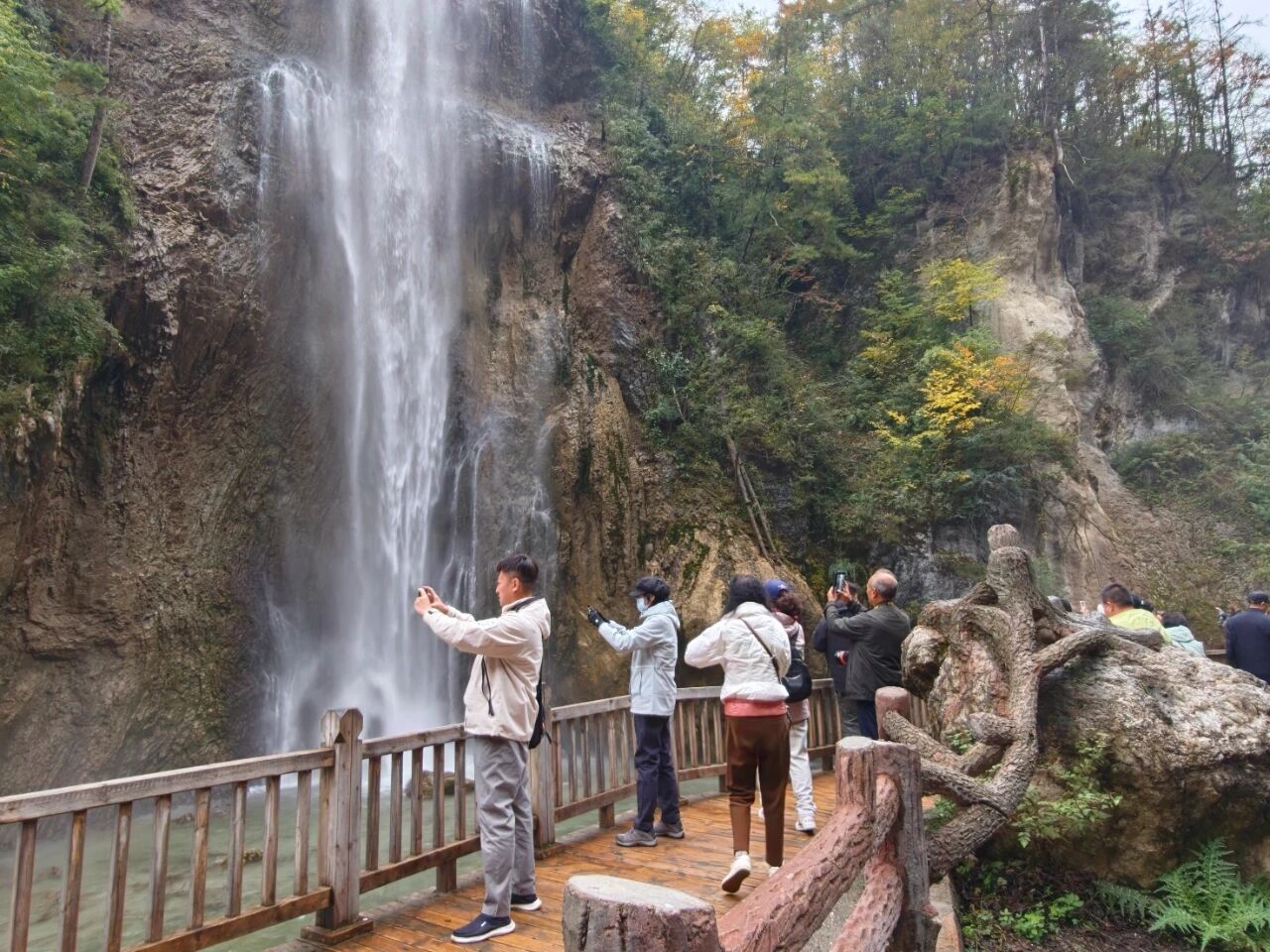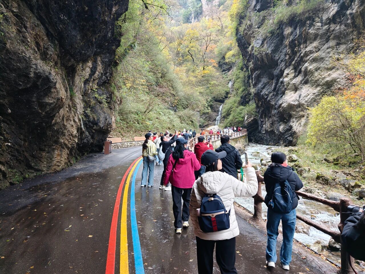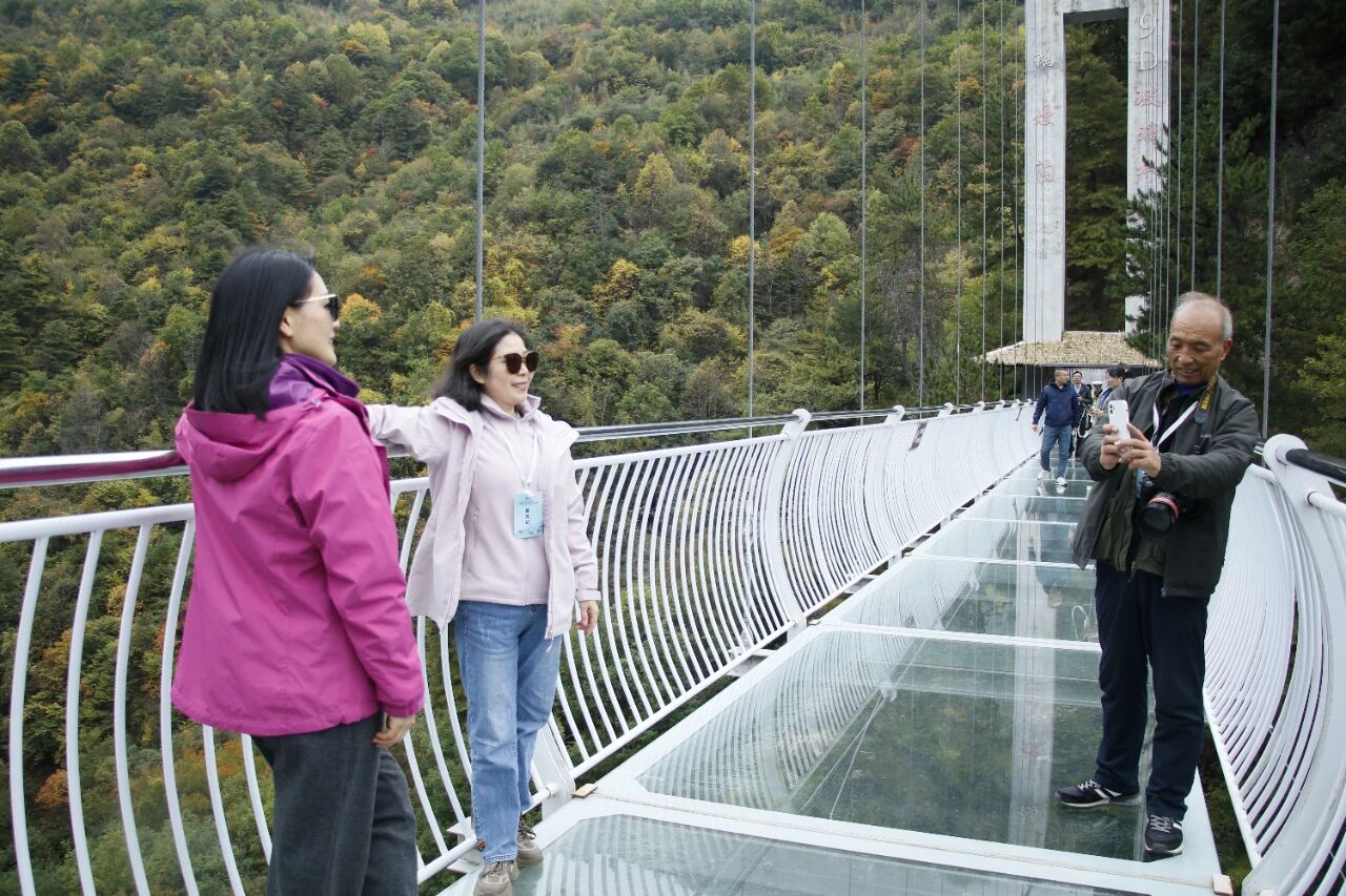 10月19日,踩线团的行程转向官鹅沟大景区。金秋时节的官鹅沟景致浓烈,澄澈的碧水映照着绚烂彩林,峡谷间云雾若隐若现,将秋日的诗意演绎到极致。踩线团还乘坐了雷鼓山索道,随着轿厢缓缓攀升,脚下层林尽染的林海交织成壮阔画卷,秋日山野的雄浑与灵动一览无余。
