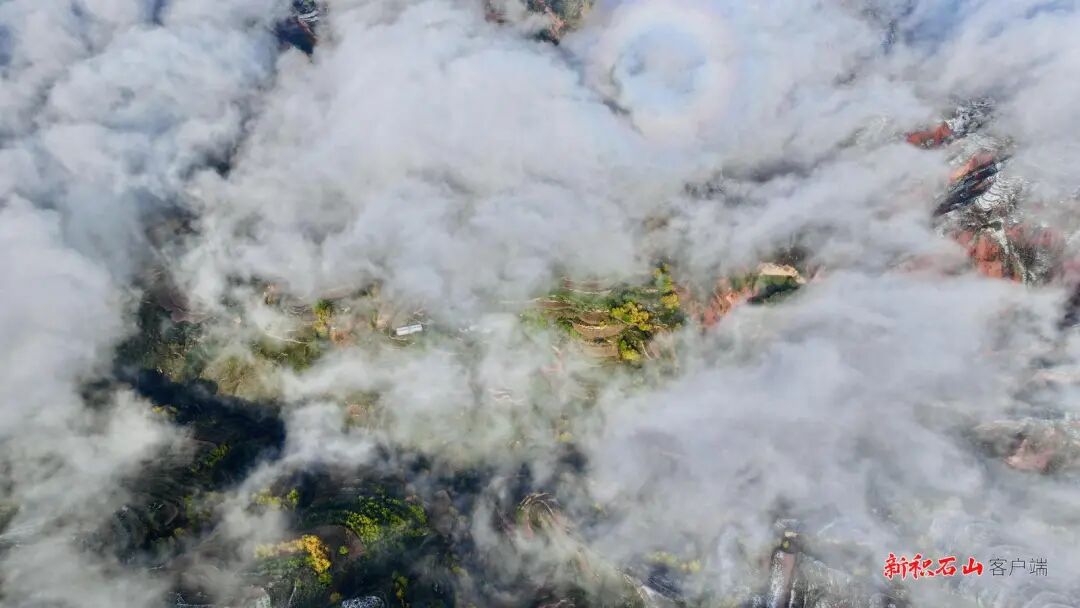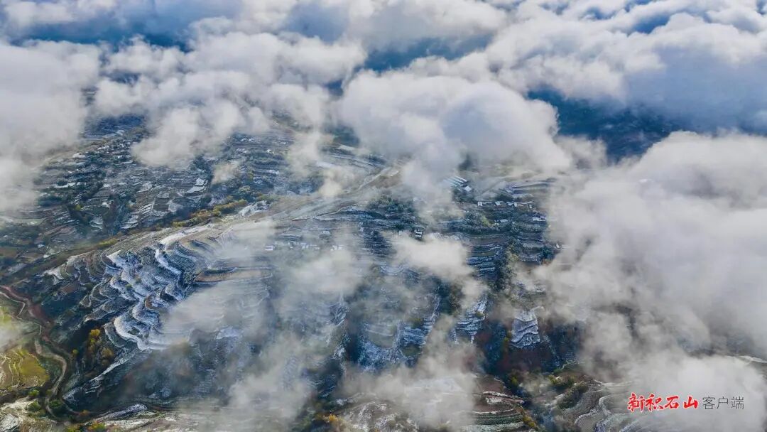 山坳里的村落隐在云雪里