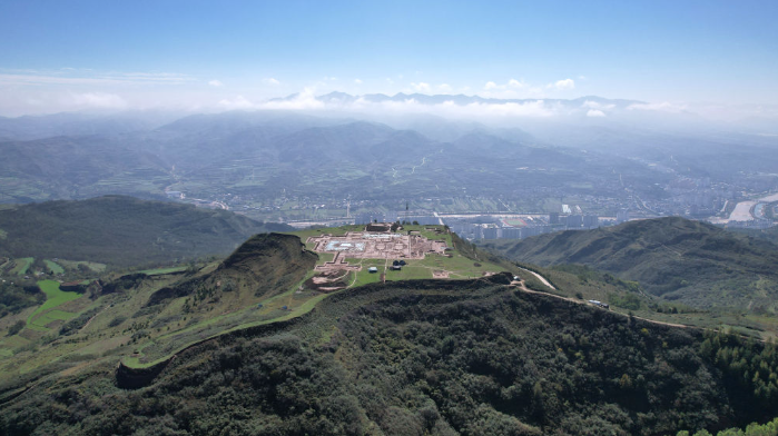 四角坪遗址位于甘肃礼县县城东北约2.5公里处的四格子山顶部。整个遗址坐落于人工“削平”的山顶平台之上,结构清晰、气势恢宏。中心是一座面积约900平方米的方形夯土台,东西南北四向各分布三组平行的门塾建筑,四角则建有曲尺形建筑,共同构成一组建筑面积约2万平方米的中心对称建筑群。这个罕见的规模宏大、格局规整的秦代大型礼制性建筑群,是国家祭祀变革与中国“大一统”历史进程的物化载体。