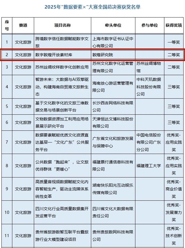 10月29日,2025年“数据要素×”大赛全国总决赛获奖项目名单公示。敦煌研究院的《数字敦煌开放素材库》项目荣获“文化旅游”赛道二等奖。