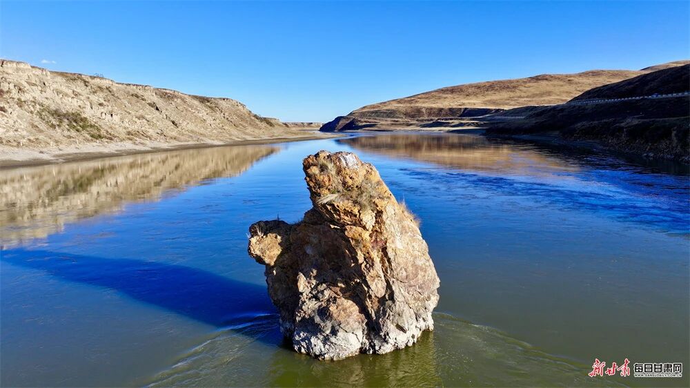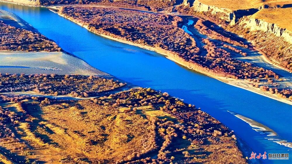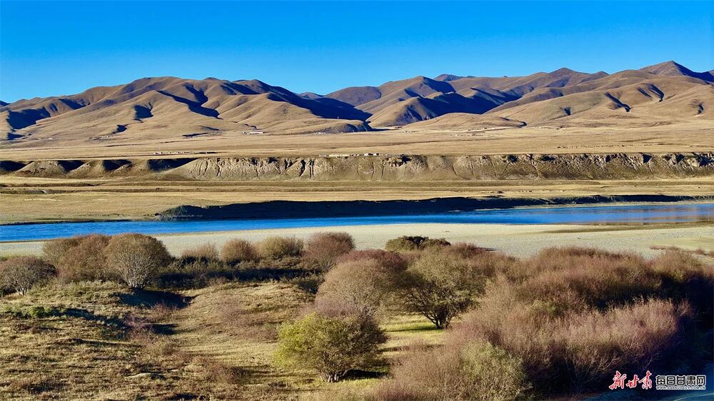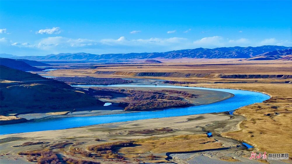 黄河水静得像一匹舒展的蓝绸,没有盛夏的奔腾,唯有脉脉流淌的从容。澄澈的水面倒映着天光云影,岸边的灌木丛褪去青绿,换上了珊瑚红的盛装,在寒风中摇曳出热烈的姿态,仿佛是大地写给季节的情书。这清透的河水,是生态和谐最动人的告白,它滋养着岸边的草木,也孕育着玛曲的生机,让每一口呼吸都满是自然的清甜。
