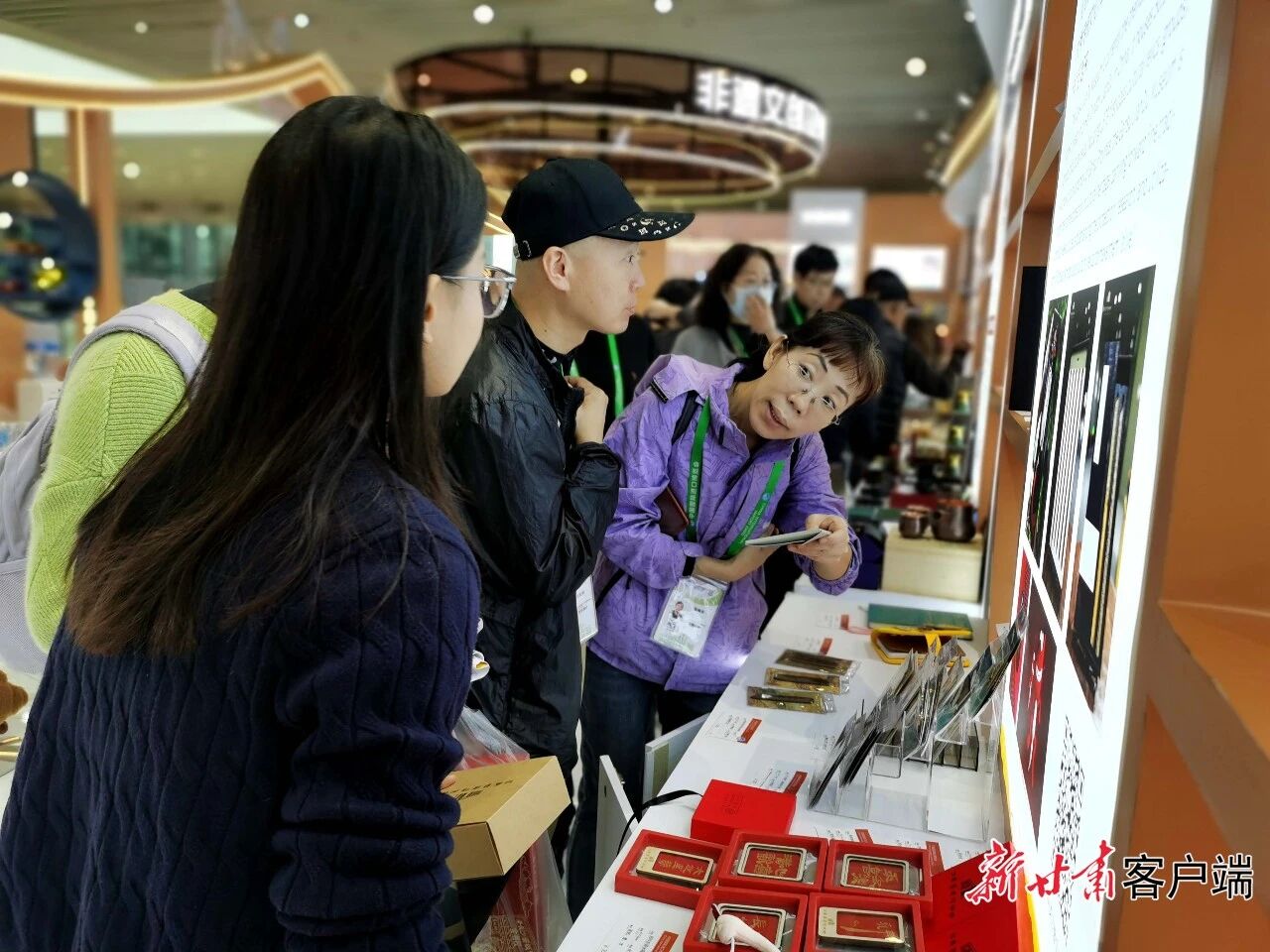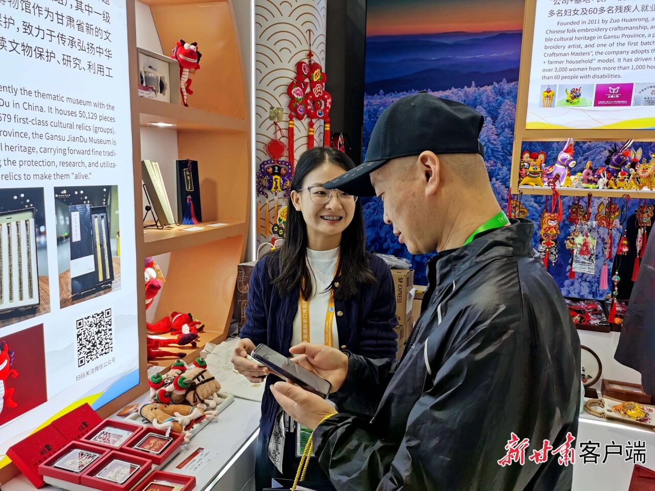 11月9日下午,第八届进博会甘肃非遗展馆里,依然客流如云。一位参观者拿着甘肃简牍博物馆制作的汉简“永年”文创产品,驻足欣赏,仔细品咂,并与展台服务人员深入交流。