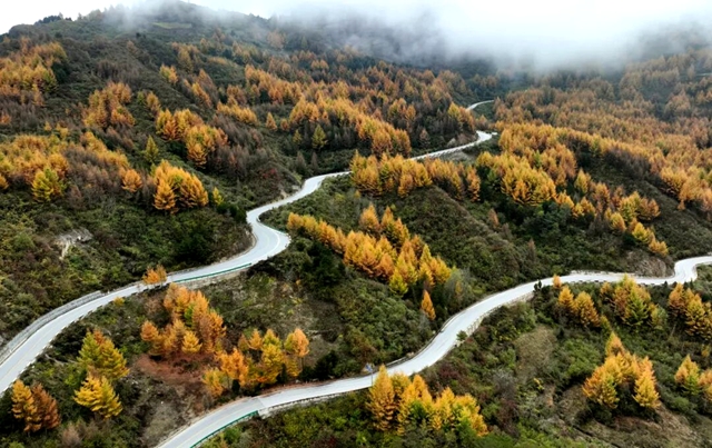 当秋风轻抚过G212国道,高楼山披上了渐变色的外衣。金黄落叶松与火红枫叶层层交织,公路蜿蜒如龙,穿行于云雾缭绕的山脊。登顶远眺,十二道拐公路连接着生活与远方,正是“不畏浮云遮望眼,自缘身在最高层”的壮阔。