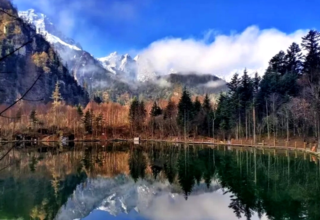 十一月的官鹅沟,秋意未散,冬雪未至,却酝酿着最温柔的邂逅。漫山彩林如打翻的调色盘,枫叶如火,桦树鎏金,溪流倒映斑斓。这里适合静坐等雪,看光影斑驳,听山谷风声,等一场不期而遇的初雪为秋色定格。