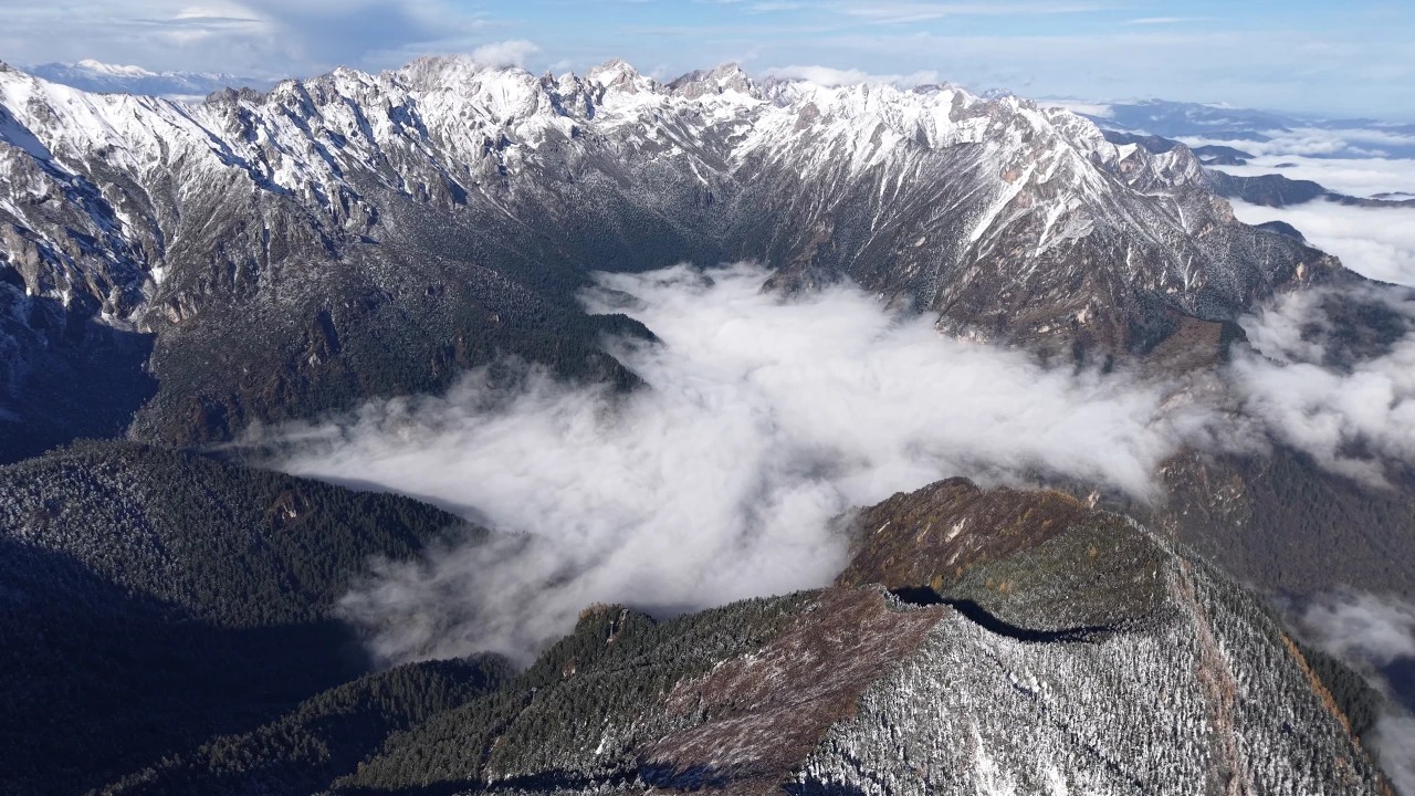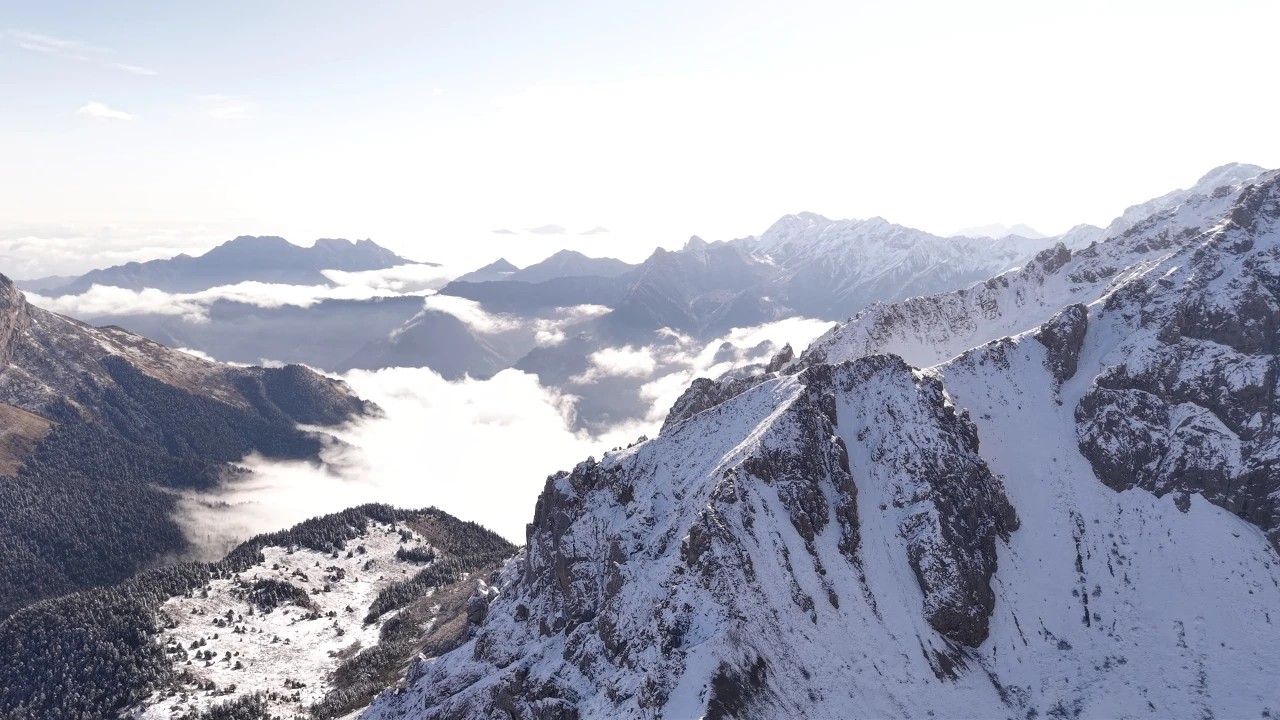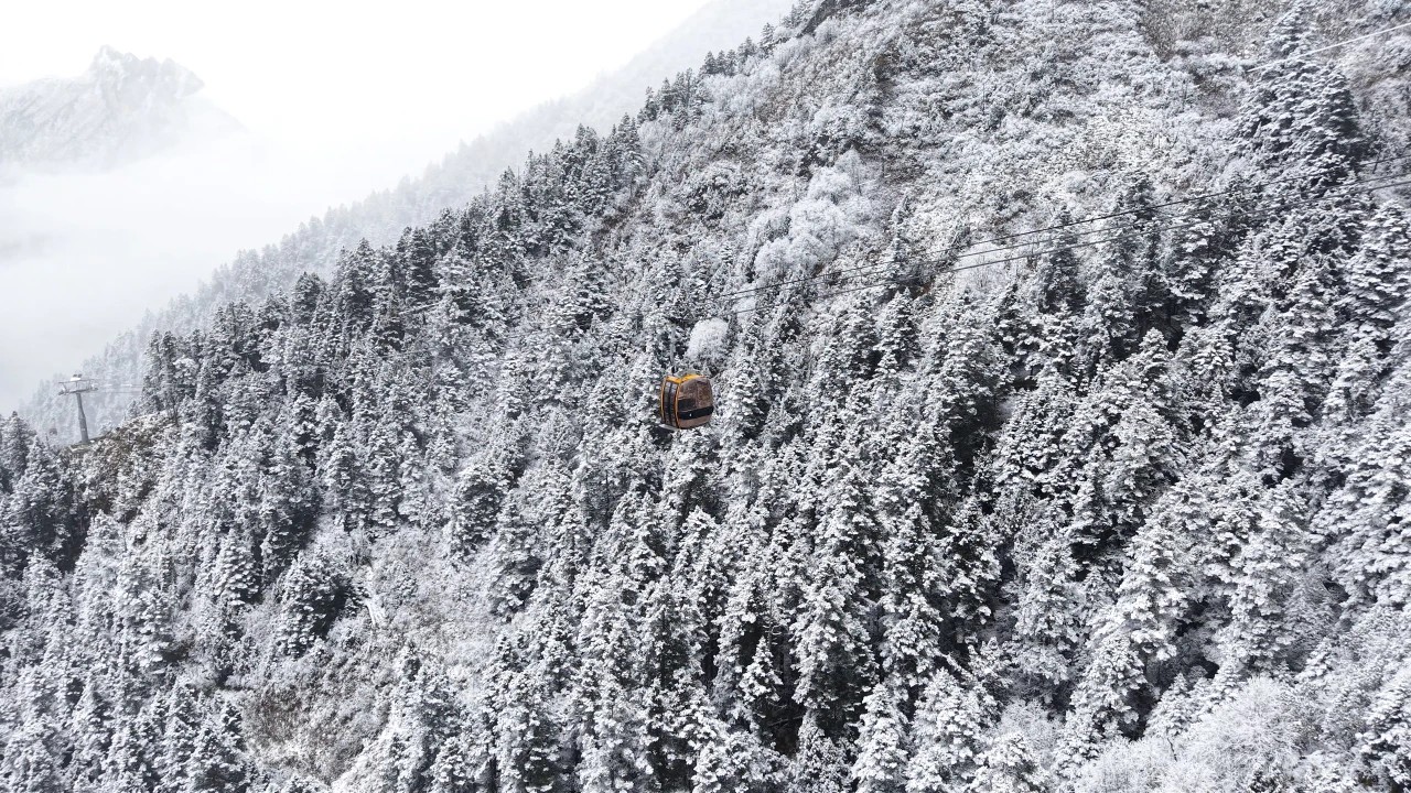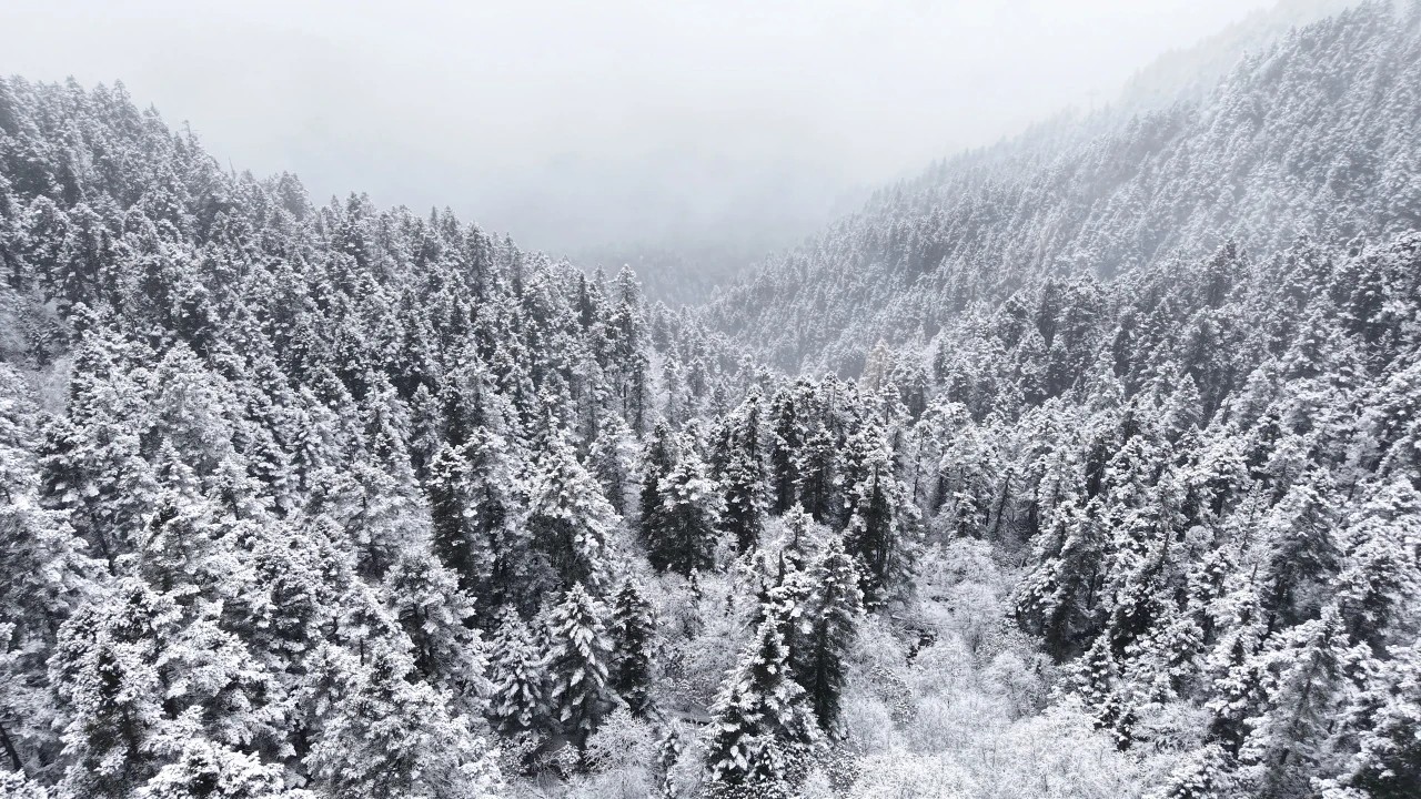 官鹅沟的初冬,是从雷古山的雪开始的。当别处还沉浸在秋的余温里,雷古山已迎来漫天飞雪,雪花轻柔飘落,为巍峨的山体披上洁白轻纱,峰峦在云雾中若隐若现,宛如仙境。站在山谷远眺,白雪覆盖的雷鼓山与下方斑斓的秋林形成鲜明对比,青黛、金黄、火红与雪白交织,层次分明,气势壮阔,成为初冬官鹅沟最独特的标识。