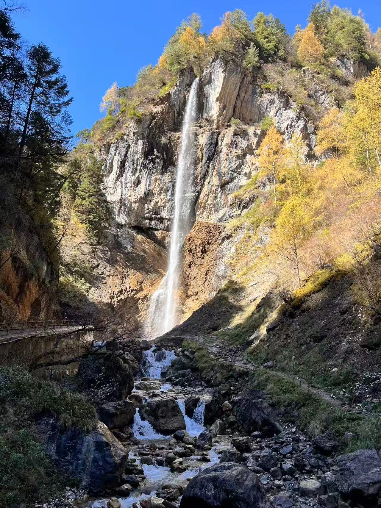 官鹅天瀑依旧保持着夏日的灵动与磅礴,水流从悬崖峭壁上倾泻而下,水雾氤氲,溅起的水花在阳光照射下折射出五彩光影。瀑布周围的林木褪去了翠绿,换上金黄、橙红的盛装,秋意正浓,与飞瀑流泉构成一幅动静相宜的绝美画卷,少了冬日冰瀑的雄浑,多了几分秋日的温婉与活力。