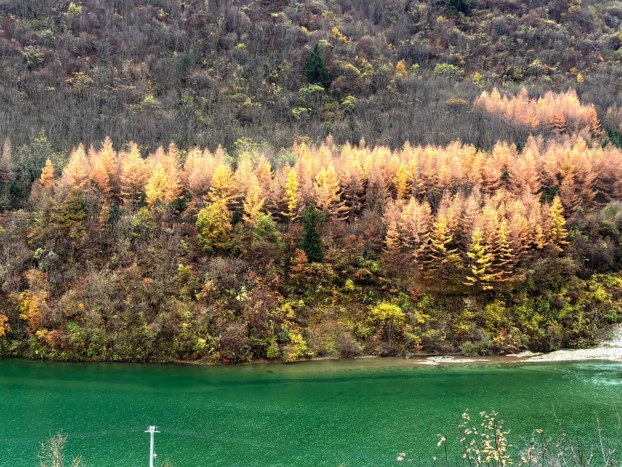山下的官鹅沟,仍是一派秋日盛景的延续。澄澈的湖泊尚未凝结,湖水依旧碧绿如玉,倒映着岸边五彩斑斓的林木,微风拂过,湖面泛起粼粼波光,与远处雷古山的雪景相映成趣,分不清是秋的绚烂还是冬的静谧。蜿蜒的溪流潺潺流淌,未受寒意侵扰,溪水清澈见底,叮咚作响,仿佛在诉说着季节交替的私语。