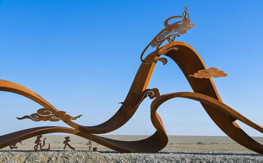 据悉,“盛世飞天”是一件融汇中华文化精神与丝路文明意象的大型公共艺术作品,作品以古代“丝绸之路”在地图上的走向为造型灵感,抽象演化为一条起伏飘扬的飘带,象征着千年文明交流的脉动与延续。耐候钢打造的丝带结构增强了作品的韵律感和动感,呈现出岁月流转的痕迹,红褐色的肌理与戈壁的自然风貌浑然一体。