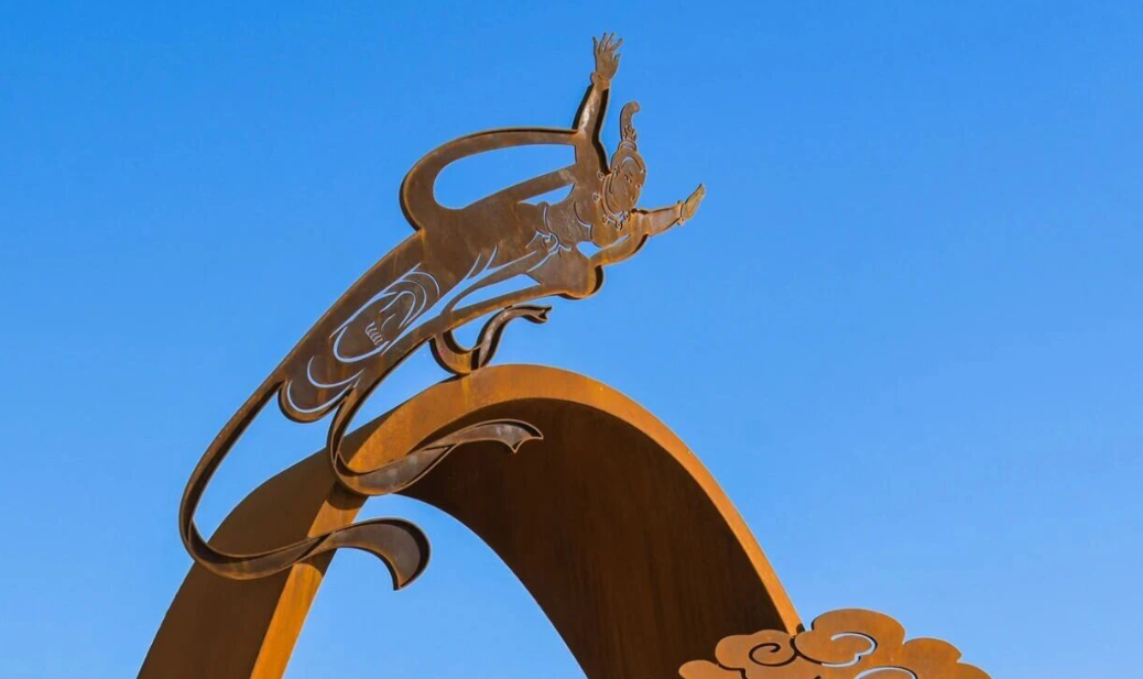 在飘带之上,一位以耐候钢剪影语言呈现美丽“飞天”凌空起舞。飞天形象以敦煌莫高窟壁画为原型,轻盈飘逸,自然地融入碧空之中,在阳光的照耀下产生多变的图景,仿佛在天地间勾勒出的一幅灵动的画卷。