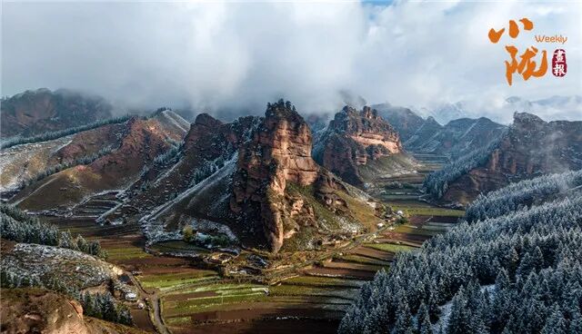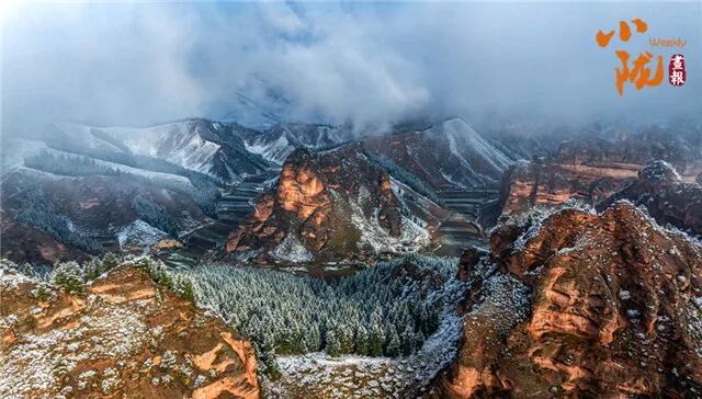 雪后天晴,烟波浩渺,山色空蒙,朱红色的丹霞与葱郁的森林、皑皑白雪相映成趣,展现出冬日里别样的壮丽与静谧。