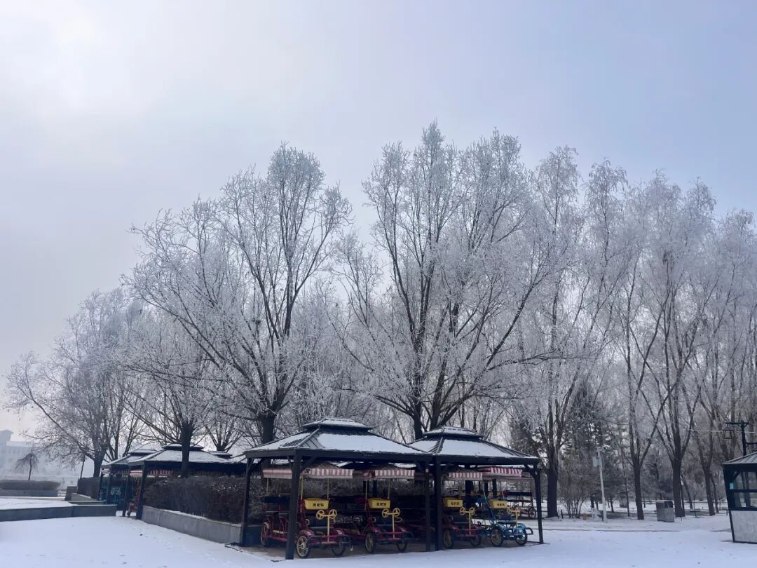大坪农业园的雾凇与黄叶相映成趣,水川湿地公园的芦苇在微风中沙沙作响。湖面雾气缭绕,与岸边的雾凇林构成一幅如诗如画的水墨画卷。