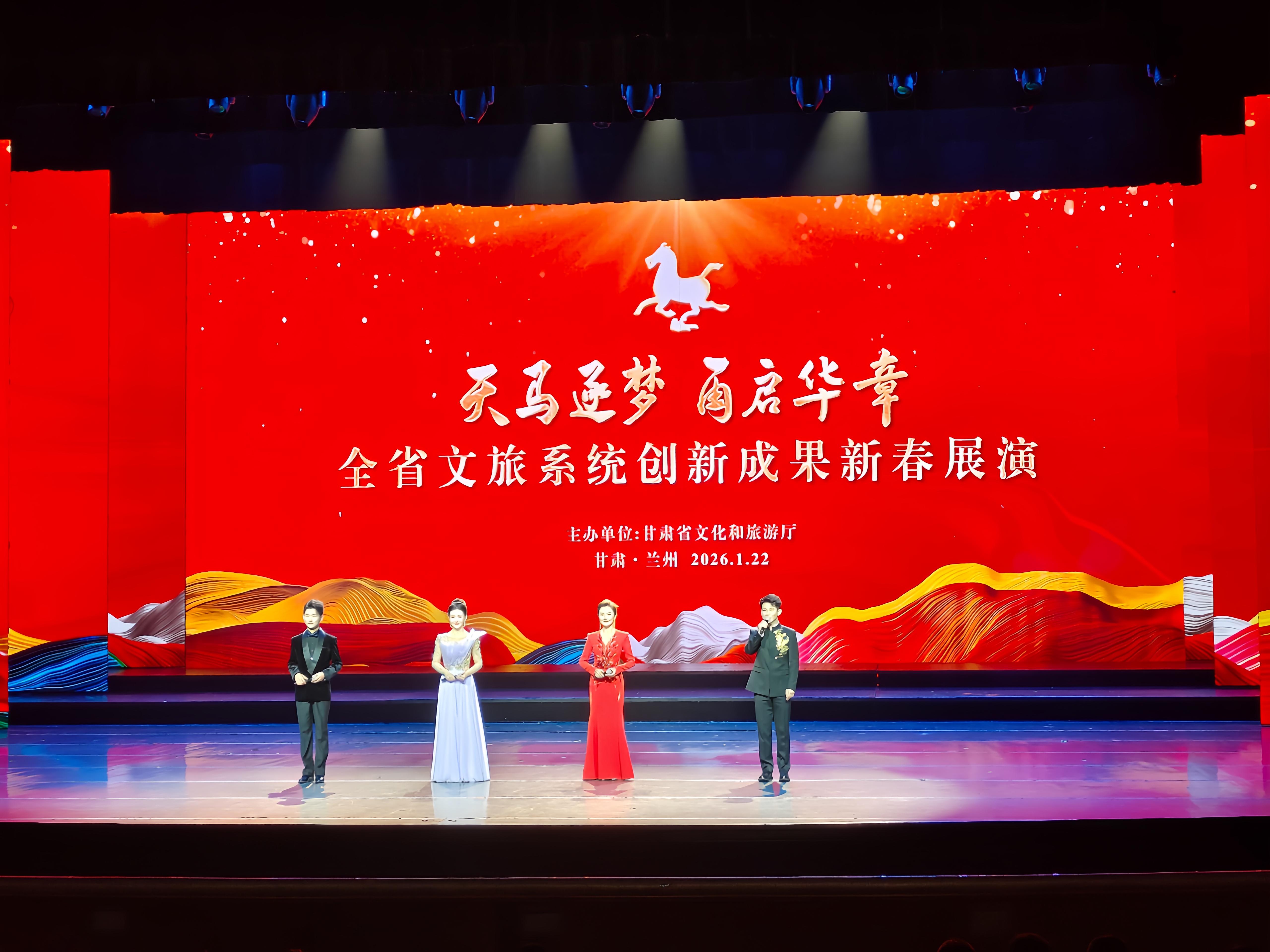 1月22日晚8点,由甘肃省文化和旅游厅主办,甘肃省歌剧院、兰州大剧院承办的“天马逐梦 再启华章”全省文旅系统创新成果新春展演在兰州音乐厅精彩上演。本次展演以文艺演出融合典型案例发布的创新形式,全方位展现2025年甘肃文旅高质量发展的丰硕成果,为新春佳节献上一场独具魅力的文化艺术盛宴。