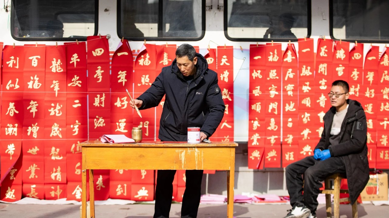 社区里的书画爱好者现场写春联送福字,墨香暖人心