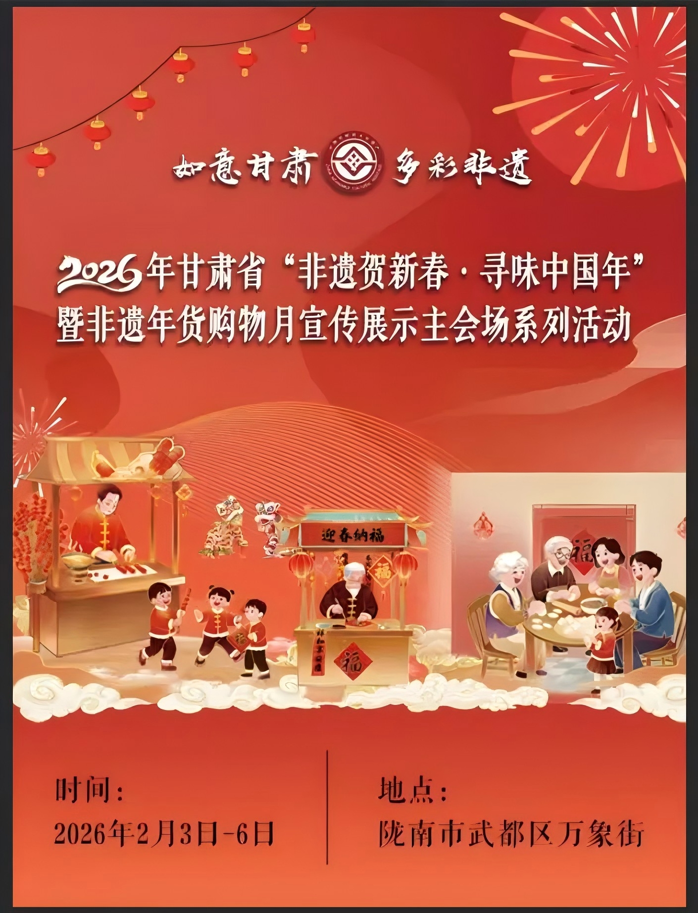 由甘肃省文化和旅游厅、陇南市人民政府共同主办的2026年甘肃省“非遗贺新春·寻味中国年”暨非遗宣传展示主会场系列活动,将于2月3日至6日在陇南市武都区万象街举行。