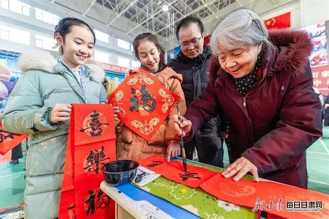 杨潇/摄 瞧!在张掖市体育馆 “万福迎春”活动正在举行 百名书法志愿者齐聚一堂 挥毫泼墨,红纸翻飞间 一幅幅笔力遒劲的春联和 一个个喜庆吉祥的“福”字跃然纸上 志愿者将美好的新春祝愿融入笔墨 为现场群众赠送“文化年货”