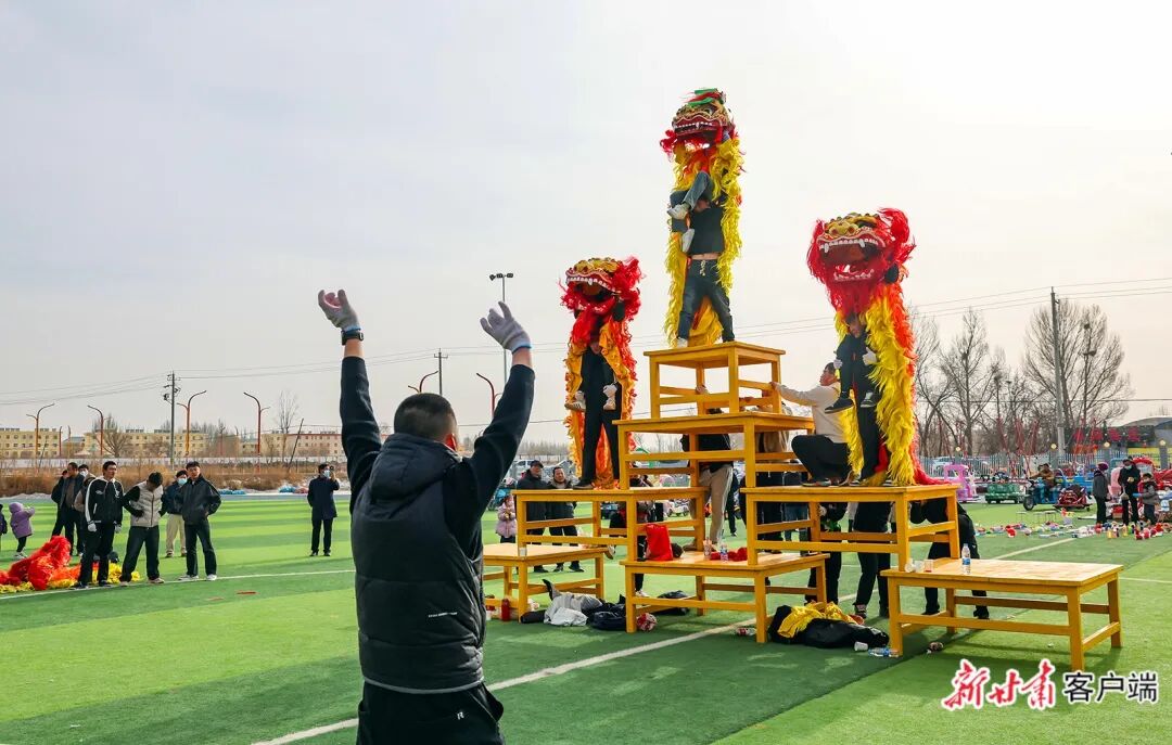 搭档刘翰与李旭德默契配合,轻盈迈步间完成忽闪眼眸、跳板凳、翻滚等一系列高难度动作,将雄狮的灵动与威猛演绎得惟妙惟肖,引得围观群众连声喝彩。